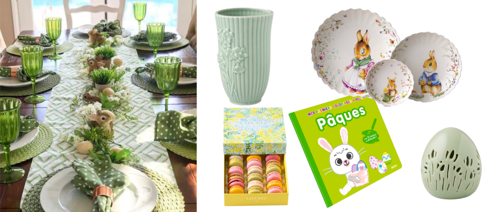 Pâques, c’est aussi le renouveau de la nature, et cette palette verte l’incarne à merveille. Du vert menthe au vert mousse, on joue sur les nuances en les combinant à des matières brutes : céramique émaillée, vases en verre bullé, accessoires en rotin ou bois naturel. Quelques feuillages frais (eucalyptus, branches d’olivier, herbes folles) disposés sur la table ou dans des soliflores donnent un effet jardin instantané. C’est l’esprit pique-nique chic, en version stylisée