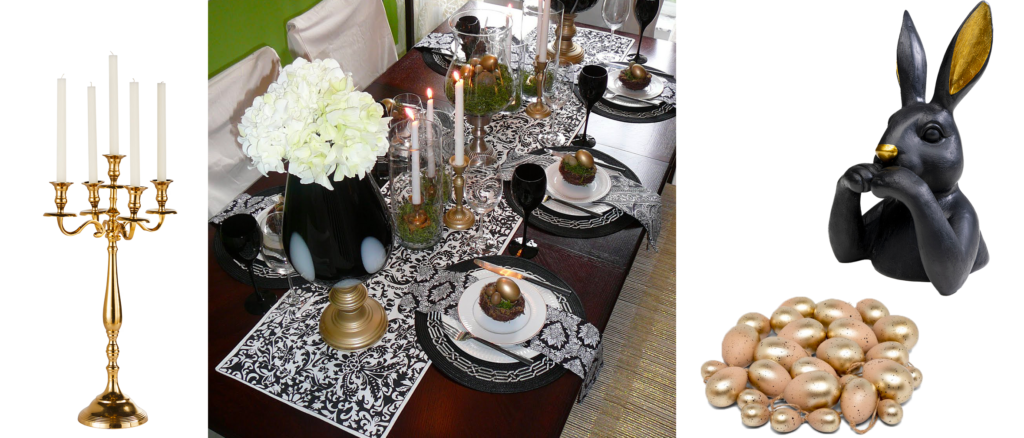 Pour une Pâques résolument moderne, on ose le contraste du noir profond et des accents dorés. Les œufs deviennent de véritables objets design en version noir mat, ponctués de touches métal sur les couverts, les photophores ou les ronds de serviette. Le linge de table se fait sobre mais texturé (gaze de coton noire, serviettes en lin anthracite), et les fleurs blanches ou crème ajoutent une respiration élégante. Le résultat ? Une table sophistiquée, audacieuse, et ultra contemporaine.