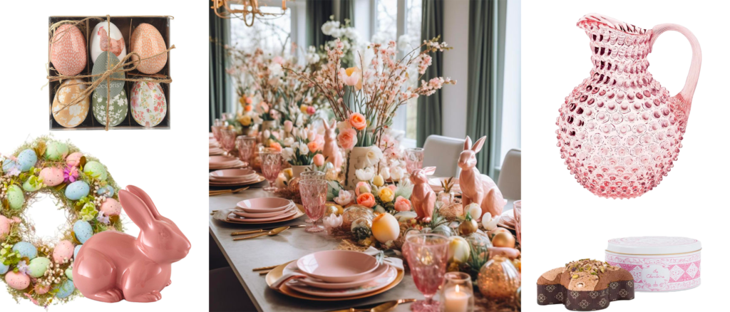 Tendre et romantique, la palette rose insuffle une atmosphère délicate à votre table de Pâques. On l’associe à des céramiques artisanales, à des serviettes en lin blush, et à des verres teintés de rose pâle pour un effet monochrome tout en subtilité. Des œufs décoratifs en verre ou en porcelaine se glissent entre des compositions florales légères à base de pivoines ou de branches de cerisier. Une ambiance qui célèbre la douceur du printemps avec une touche de féminité contemporaine