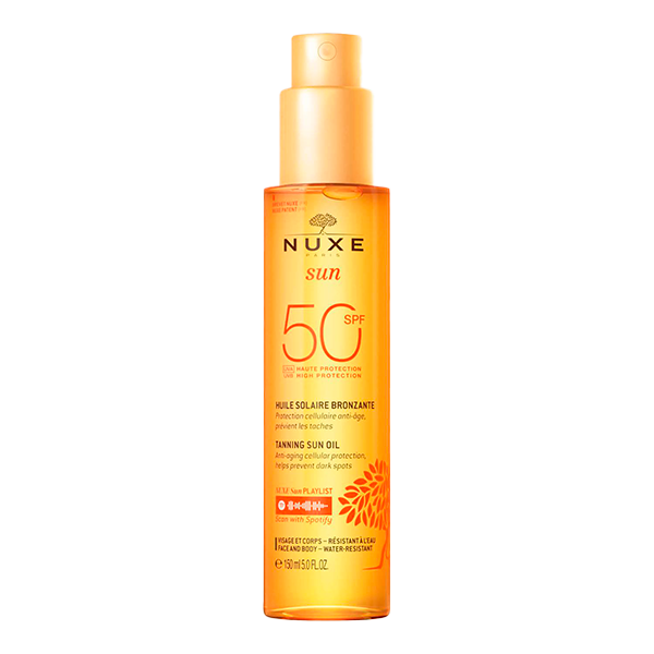 Dans la gamme NUXE Sun, l’Huile Solaire Bronzante SPF50 assure une protection large spectre contre les rayons UVA/UVB, prévient le vieillissement prématuré de la peau dû au soleil et limite l’apparition des taches. Sa texture très agréable pénètre rapidement sans laisser de film gras, laissant un fini satiné qui sublime votre bronzage. Vous serez enveloppé(e) d’un parfum enivrant aux notes d’Orange douce, de Fleur de Tiaré et de Vanille. On salue le système innovant de pompe ON/OFF de NUXE Sun, permettant de supprimer les capuchons en plastique et de réduire les risques de pollution. Ce soin, offre une résistance à l’eau et est non comédogène.
