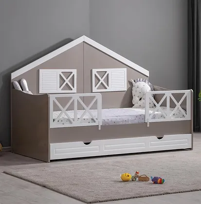 Construit à partir de panneaux de matières de 1ère qualité, le lit Luna Montessori fait office de cabane douillette pour y faire les rêves les plus doux et développer son imaginaire. Le lit bébé pourra accueillir un deuxième couchage grâce à son tiroir pour y adapter un matelas. Une jolie couleur taupe qui conviendra aussi bien aux garçons qu’aux filles. Disponible sur vincamajor.ch.