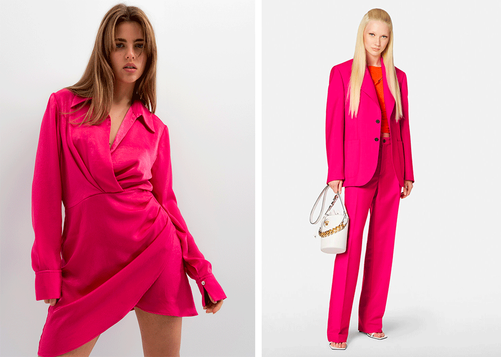 Total look fluo chez Versace avec un tailleur pantalon masculin très élégant de couleur rose fluo, porté avec un crop top orange pétillant pour une élégance affirmée.