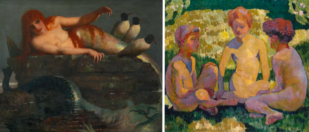This introspective tone continues in the symbolist rooms, where myth, melancholy and allegory take over. Stylized female figures, dreamlike creatures or dark landscapes by Ernest Biéler and Arnold Böcklin invite us into a realm of hidden realities.