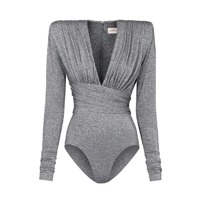 Disco atmosphere at Alexandre Vauthier for this metallic stretch jersey bodysuit with its V-neckline and draped belt. It will make a splash in the hot evenings this summer worn with high-waisted jeans or a more feminine formula: with a long bohemian skirt.