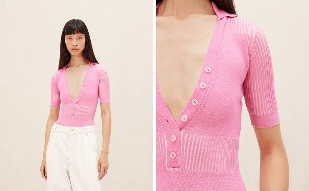 Wise or not by Jacquemus with this Yauco bodysuit featuring a plunging semi-buttoned neckline with mother of pearl buttons. This two-tone knit bodysuit with a fitted shape can easily go from a classic outfit worn with pants or ultra feminine worn with a pencil skirt.