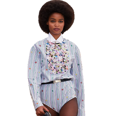 Chic and shocking the Chanel shirt bodysuit in embroidered cotton poplin with multicolored stripes that we wear proudly perched on stilletos.