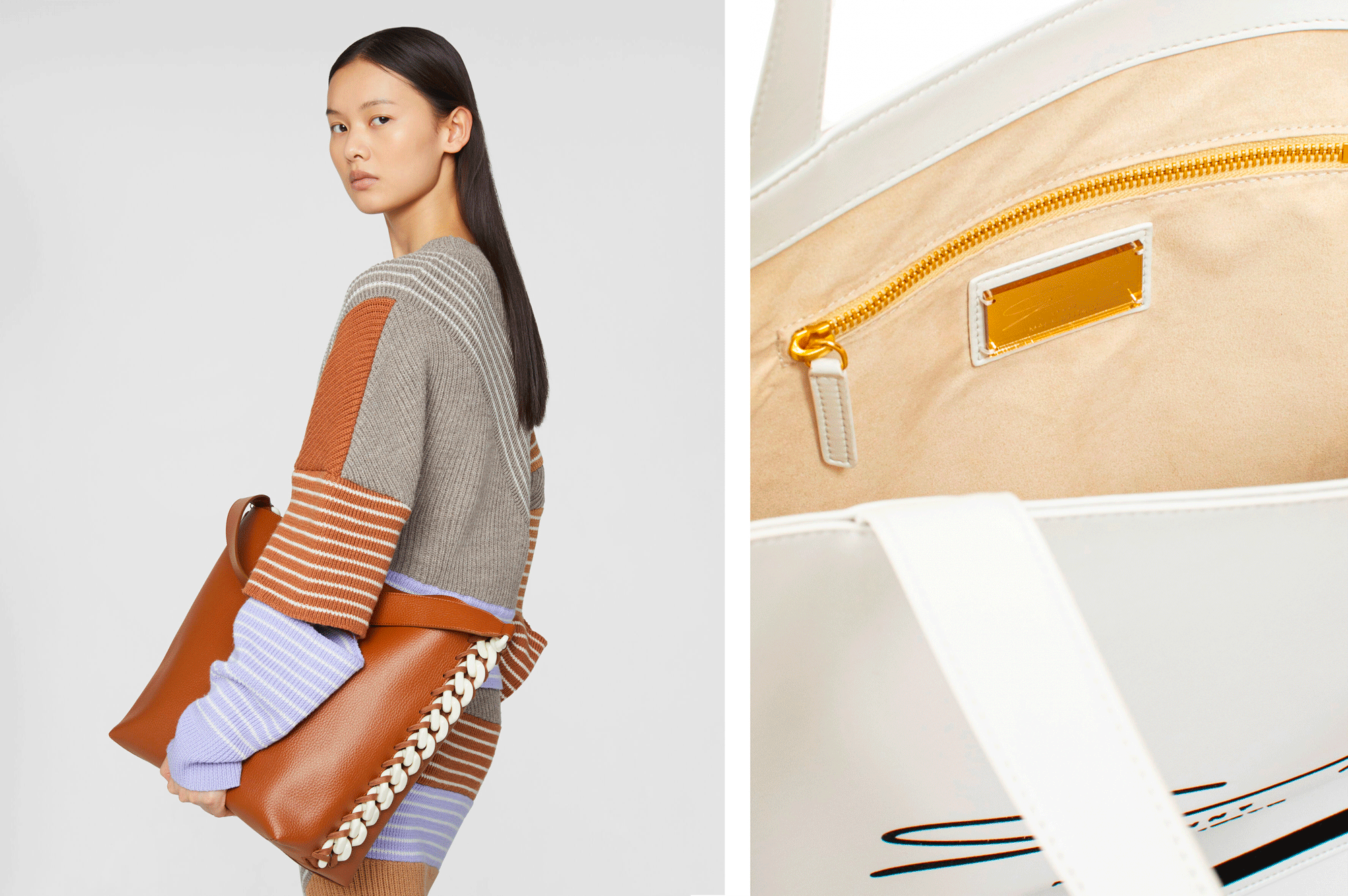 The Italian brand Genny and its ultra-feminine fashion has also taken the turn of a sustainable and environmentally responsible fashion. Some models of handbags, to find this season, are made of apple residue and organic cotton. Here is the black and white shopper bag from the brand, proudly displaying its origins “Made in Italy”.