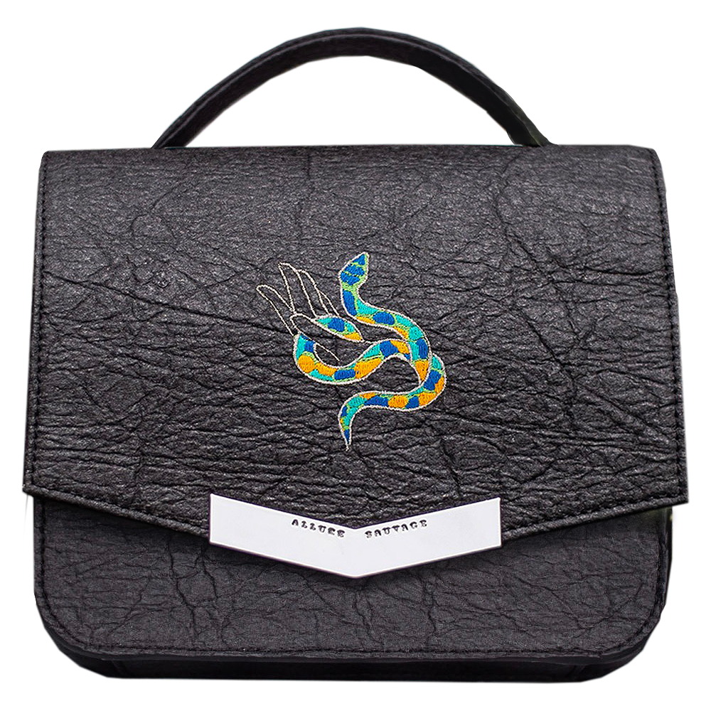 Allure Sauvage is a Franco-Swiss brand that chooses luxury, yet ethical and cruelty-free alternatives to vegetable-based leather. Their collections are currently made with Piñatex®, made from pineapple leaf fibers. This brand is the first to offer this embroidered textile, and the first to create accessories from this material in Switzerland. La Charmeuse is the name of this modern and stylish bag model, decorated with hand and snake embroidery, to be worn in the city as well as in the evening.