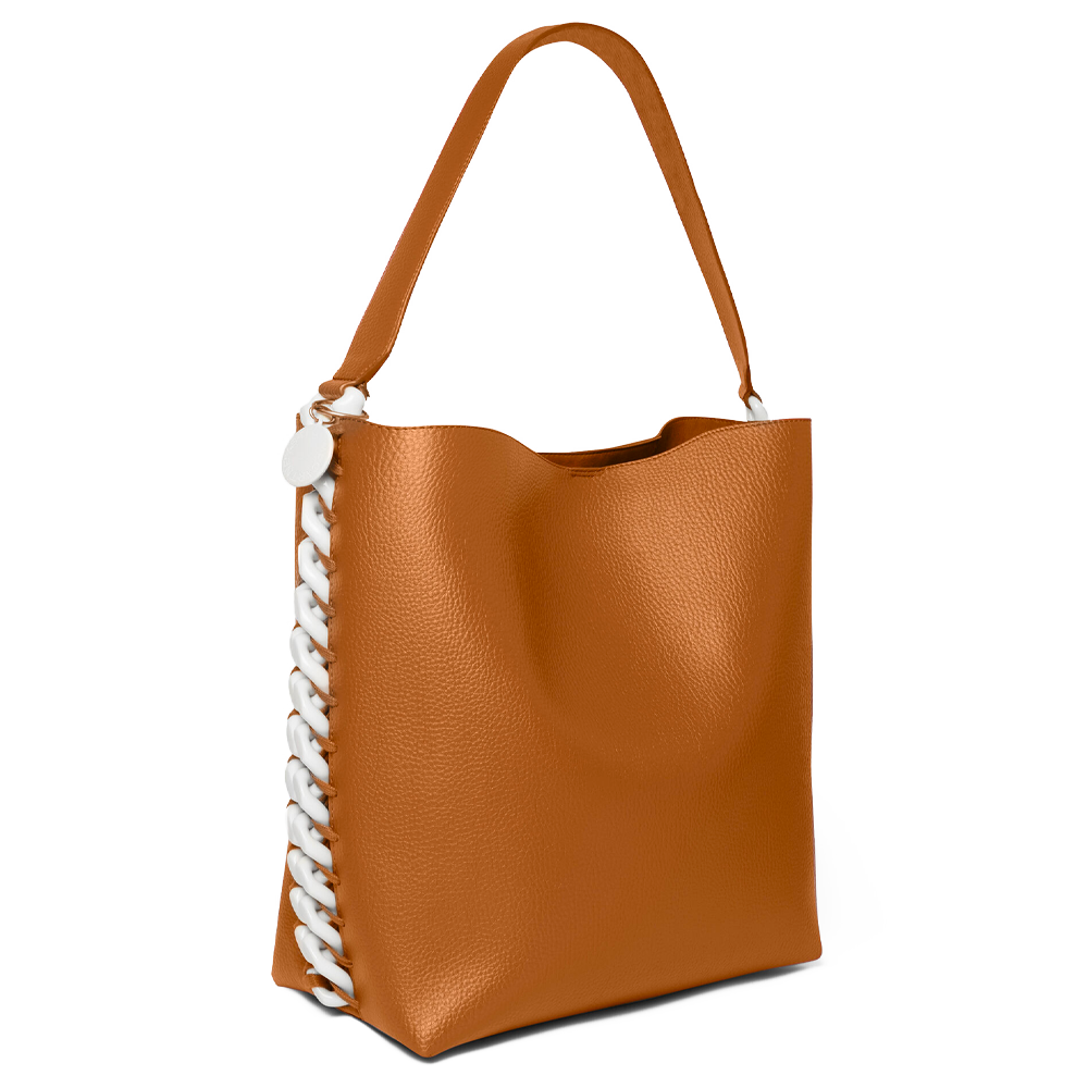 Stella McCartney is one of the pioneering fashion designers in this field, vegan of course! Her Falabella bag model released in 2010 was a phenomenal success. Since then, we find every year new models, all more attractive than the others with a trendy but eco-responsible look. We chose a new Stella McCartney bag, the Frayme tote bag, revisited and iconic Stella, made in Alter Mat grained, the alternative vegan luxury leather. This tote bag is framed with an oversized version of the iconic Falabella chain and is updated with a mix of galvanized metals.