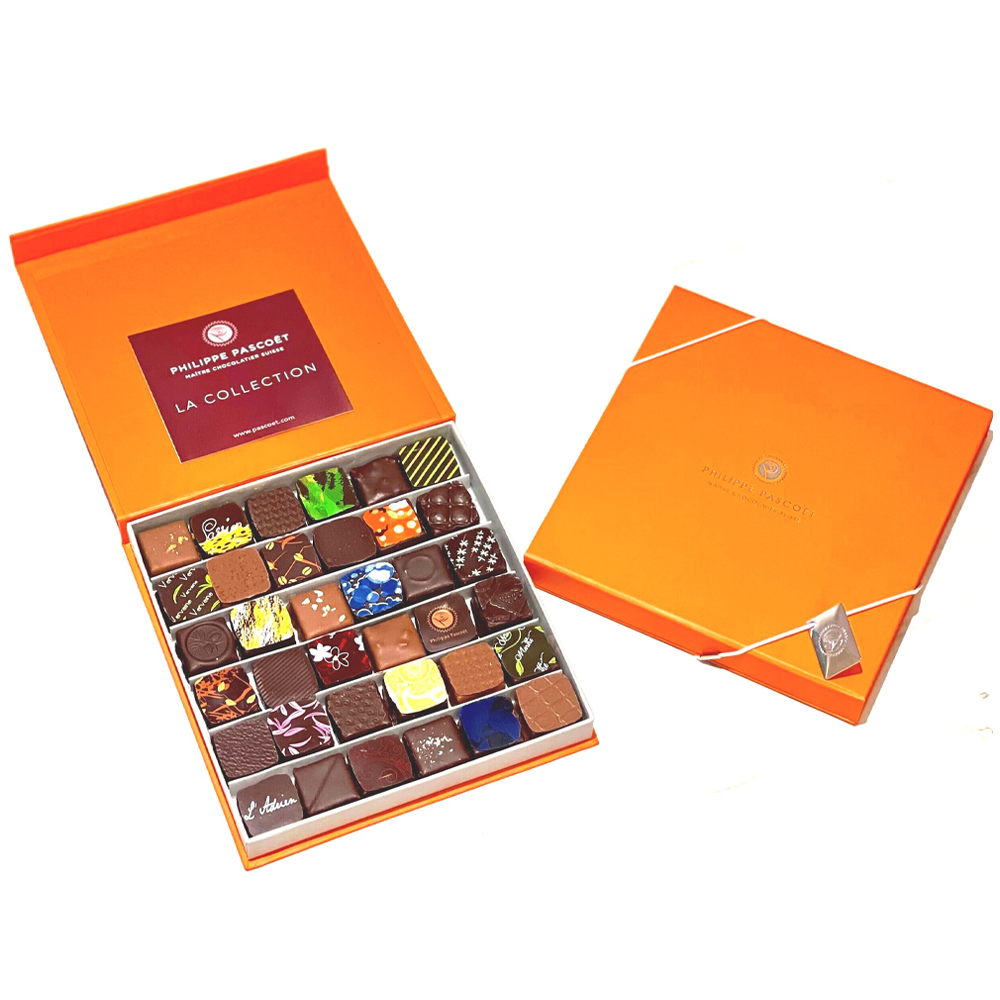 The Philippe Pascoët chocolate assortment box is colorful, surprising and varied, perfect for holiday giving. The assortment contains chocolates with flavors of aromatic herbs, spices, tea, fruit pulp, and great wines. Enough to make your guests drool!