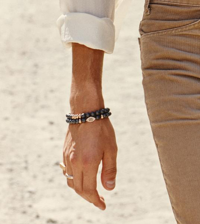 Designed by Hedi Slimane, men’s jewelry has a big place in the house’s universe. Promoting freedom and going beyond the limits of gender, we discover them in a Summer version with shell charms or more raw with mesh bracelets and latches. To stay in a half measure we choose for example a black monogrammed model with discreet lettering that underlines the refined (and affirmed) side.