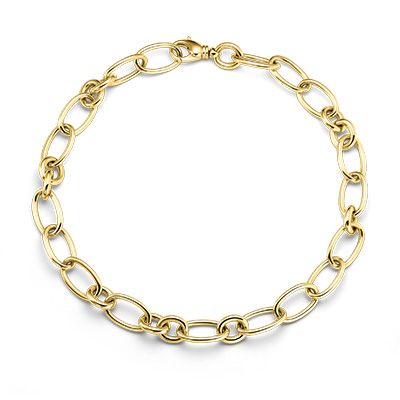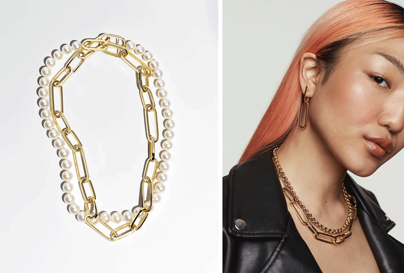 At Bucherer, it is advised to wear chunky styles! We dare to wear necklaces with large links to mix with thinner chains and even layer them with other materials like pearls. To summarize, the more you accumulate, the more you create a bold style. Here, we find in the Classics collection a lovely necklace in 18k yellow gold, a 43cm chain assembled with delicate links of different sizes that we will associate with a pearl necklace and a thinner chain.