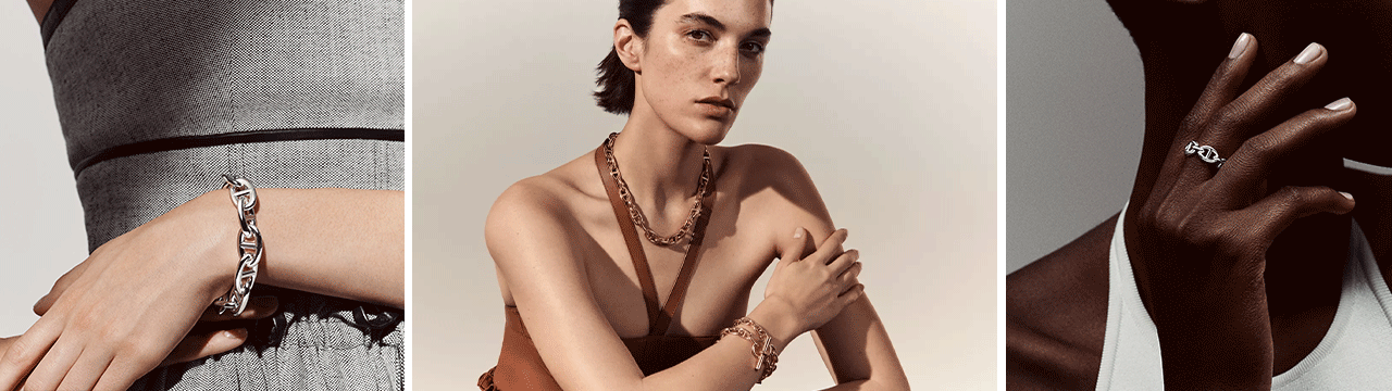 The emblematic anchor chain imagined 80 years ago by Robert Dumas, a member of the Hermès family, continues to inspire the current Creative Director of Hermès Jewelry, Pierre Hardy, who relies on his unparalleled chain-making expertise to create modern designs. The polished, pearled or twisted links are used in long necklaces, necklaces, rings, earrings and bracelets. Hermès Chaîne d’Ancre jewelry remains timelessly chic and sporty, the jewel of desire!