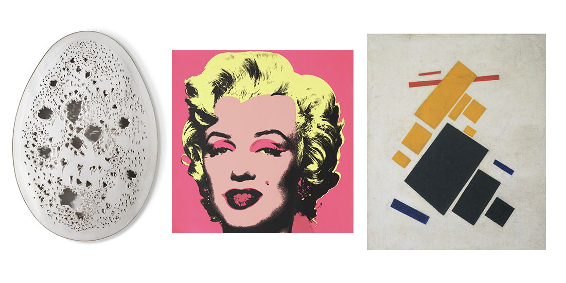 “Fine de Dio” by Fontana – “social portrait” Marilyn Monroe by Warhol – “Suprematist Composition: Airplane Flying” by Malevitch