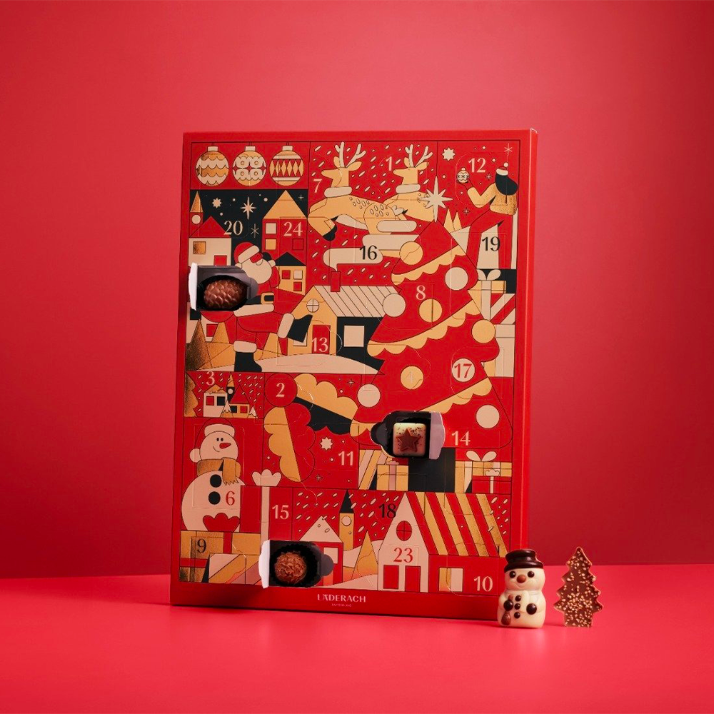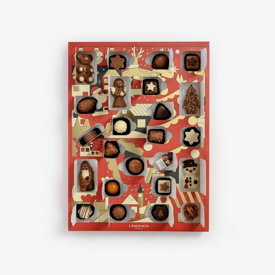 Beneath its new artistic design, the LĂ€derach Advent calendar reveals a daily chocolate surprise crafted in the brandâs Swiss ateliers. Delicate pralinĂ©s, melt-in-the-mouth truffles, and hand-shaped festive figurines come together to create a gourmet and refined experience.