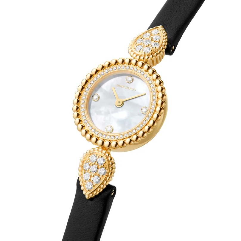 Serpent Bohème by the Maison Boucheron embodies the perfect marriage of jewellery artistry and watchmaking mastery. Its 18-carat yellow gold case is enhanced by 66 round diamonds (0.86 ct) and finely polished gold beads. Two diamond-paved drops add an emblematic touch, recalling the Serpent Bohème spirit. Its white mother-of-pearl dial, illuminated by four diamond hour-markers, plays with the light for timeless elegance. Powered by a high-precision quartz movement and fitted with a black calfskin strap, this watch is water-resistant to 30 metres, combining beauty and practicality.