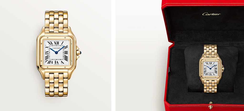 The watch Panthère by Cartier is a symbol of timeless elegance. This large model in 750/1000 yellow gold has harmonious dimensions (31 mm x 42 mm) and a delicate thickness of 6.71 mm. Its silvered dial, adorned with blued steel hands and a crown set with a blue sapphire, embodies Cartier’s distinctive style. Water-resistant to 30 metres, it is complemented by a yellow gold bracelet, offering the ultimate in festive refinement.