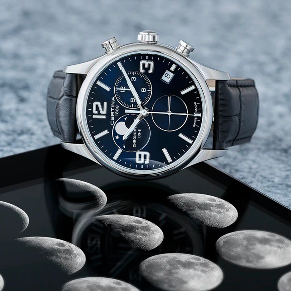 Here, the moon phase complication is integrated into a contemporary chronograph. A technical yet refined interpretation of the lunar cycle.