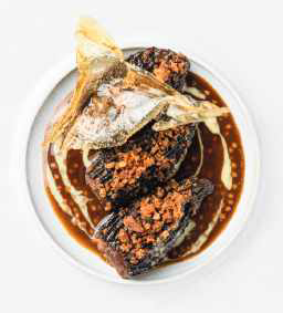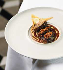 2 – Napper le fond des assiettes de jus brun de champignons. Ajouter harmonieusement quelques traits de crème de réglisse. Saupoudrer les morilles de miettes croustillantes et les dresser au centre des assiettes. Surmonter d’une tuile cristalline. Servir le sabayon devant les convives.
