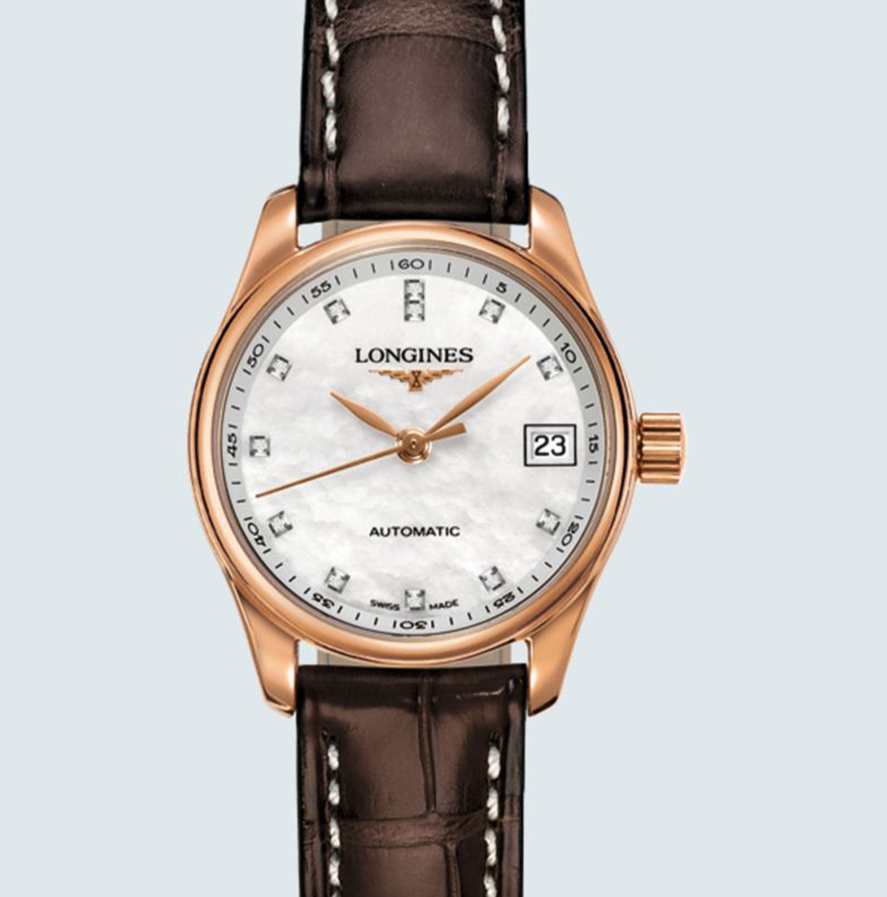 On reconnait vite un modèle de chez Longines, avec son élégante sobriété conjuguée à son esprit sportif. The Longines Master Collection en est la parfaite illustration contemporaine, ainsi que le démontre le succès rencontré par cette collection depuis son lancement en 2005. Son beau cadran nacré blanc serti de 12 diamants laisse s’égrainer le temps avec subtilité grâce aux jolies aiguilles roses. Un calibre éponyme L592 au mouvement automatique permet une réserve de marche d’environ 45 heures. Un modèle qu’on pourra porter aisément aussi bien le jour que le soir.