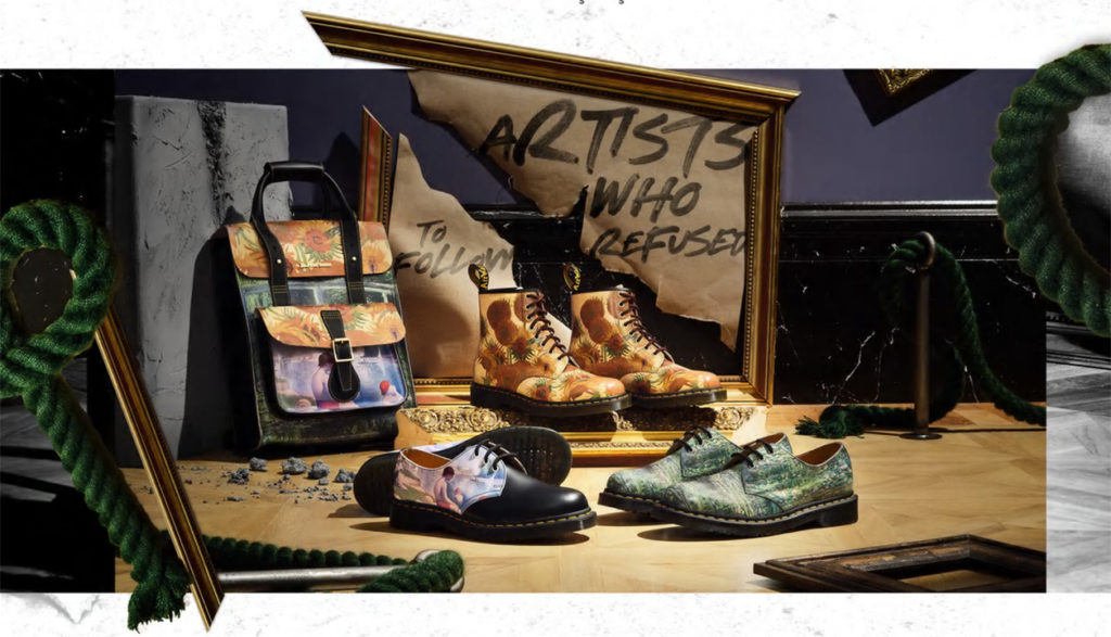 Pour cette collaboration 100% british, la marque aux chaussures « punk » et honteusement solides s’est associée à la londonienne The National Gallery. De ce partenariat sont nées quatre pièces, trois modèles de chaussures et un sac, qui mettent en valeur trois grands peintres du XXe siècle. Pour la première paire, les bottes 1460 sont habillées avec les fameux tournesols, signés Vincent Van Gogh, ainsi qu’agrémentés de lacets marron foncé, œillets en or brossé et des fameuses surpiqûres jaunes. Pour les deux autres, c’est le modèle 1461 qui a été détourné. Ainsi, les fameux nénuphars de Claude Monet glissent délicatement de Giverny sur le cuir Backhand Strawgrain pour un look aux tons verts. La troisième création est un mélange entre le devant noir très classique de la chaussure, alors que sa partie arrière est recouverte avec « Une baignade à Asnières » de Georges Seurat. Mariage extravagant entre grunge et palette pastel ! Et pour rendre hommage aux trois artistes en même temps, Dr. Martens a également conçu un sac à dos totalement arty, mélangeant les trois chefs-d’œuvre sur une seule pièce ! Une jolie revanche pour les trois impressionnistes, refusés des Salons de l’époque, qui ont décidé de rompre avec les règles. Si cette collaboration customisée est absolument unique, ce n’est pas la première fois que la marque s’offre les toiles des grands maitres. Depuis, une autre collection est parue, cette fois-ci en partenariat avec The Met et placée sous influence japonaise. Les codes sont ainsi déjoués !