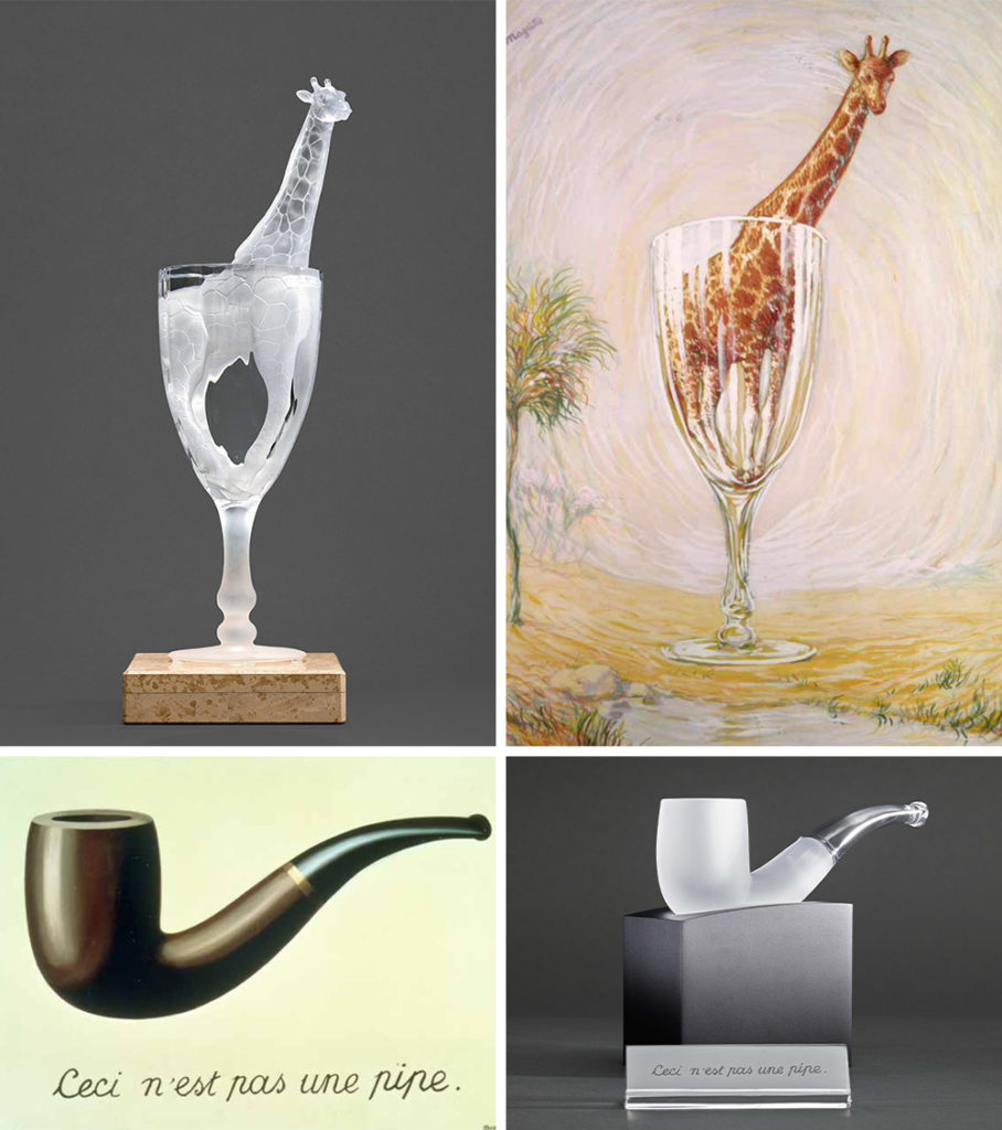 Ce n’est pas un hasard si Lalique a également décidé de mettre en avant l’univers à la fois figuré et énigmatique de René Magritte. En effet, cette année marque les 125 ans de la naissance de cet artiste belge hors normes et hors codes. Mais comment aborder le travail de ce surréaliste, suivant son langage si unique ? Lalique a répondu à cette question en faisant descendre les objets cultes de l’art Magritte de leurs tableaux pour les habiller de cristal ! Ainsi, même si la fameuse pipe s’est réapproprié sa forme de pipe, elle ne l’est toujours pas. De la même façon, d’autres objets emblématiques des peintures de Magritte se sont vu attribuer une représentation 3D, puisant dans le savoir-faire de Lalique. Il y a d’abord cette représentation de pommes, fil rouge sur une douzaine de tableaux. Tantôt toutes seules, tantôt en binôme, tantôt masquées dans l’œuvre du maître, cette diversité a été reprise par Lalique en créant deux versions distinctes. Ensuite, la marque a revisité le seul objet qui existait déjà en dehors des tableaux : le chapeau melon, que Marcel Mabille a dû acheter suivant les instructions très précises de l’artiste. Cela dit, Lalique l’a complètement détourné de sa taille d’origine, sans même parler de sa fonction première. Finalement, la collection se termine avec la pièce maitresse : « Le Bain de cristal » de 50 centimètres. Avec son jeu de parties transparentes et satinées et sa disproportionnalité de taille entre le verre et la girafe, la Maison a réussi à renforcer cette confusion, tant recherchée par l’artiste. Le ton est donné !
