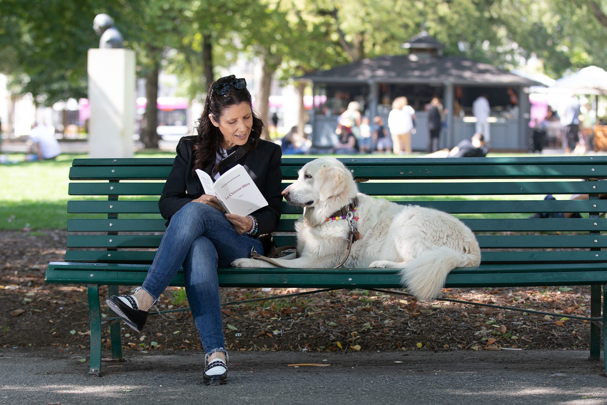 Simona Brunel-Ferrarelli est arrivée, accompagnée de sa chienne Luna, un magnifique Golden Retriever, qui a été sa grande source d’inspiration pour l’écriture de son dernier roman, La Chienne-Mère. Ce livre aborde les rapports entre une mère et une fille, la violence intrinsèque d’une famille, les difficultés à se faire une place dans la société, un parcours fatal vers la délinquance. L’adoption d’une chienne à l’amour sans concession va créer un lien si fort avec la petite fille, l’espoir au meilleur. Mais cela va-t-il être le cas ? Une histoire construite à la manière d’une tragédie grecque soutenue par des mots acerbes que l’auteure fait virevolter avec habileté pour faire mouche à chaque page. L’amour maternel au coeur du débat, une réflexion sur le rôle de l’amour avant même d’exister.